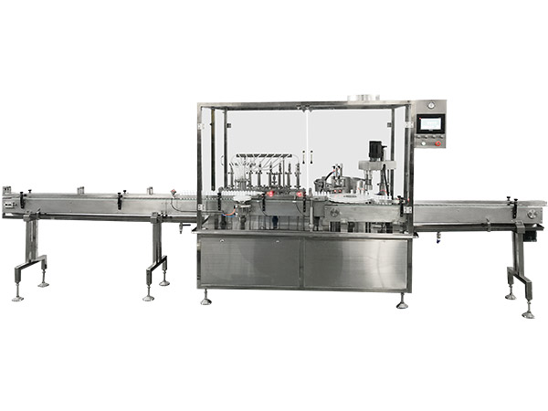 該設備是集灌裝旋蓋於一體,主要用於玻璃瓶或塑料瓶的灌裝、上蓋、封口。為雙軌灌裝,雙軌進瓶,雙旋頭旋蓋的直線間歇方式工作,結構緊湊,符合GMP要求。
